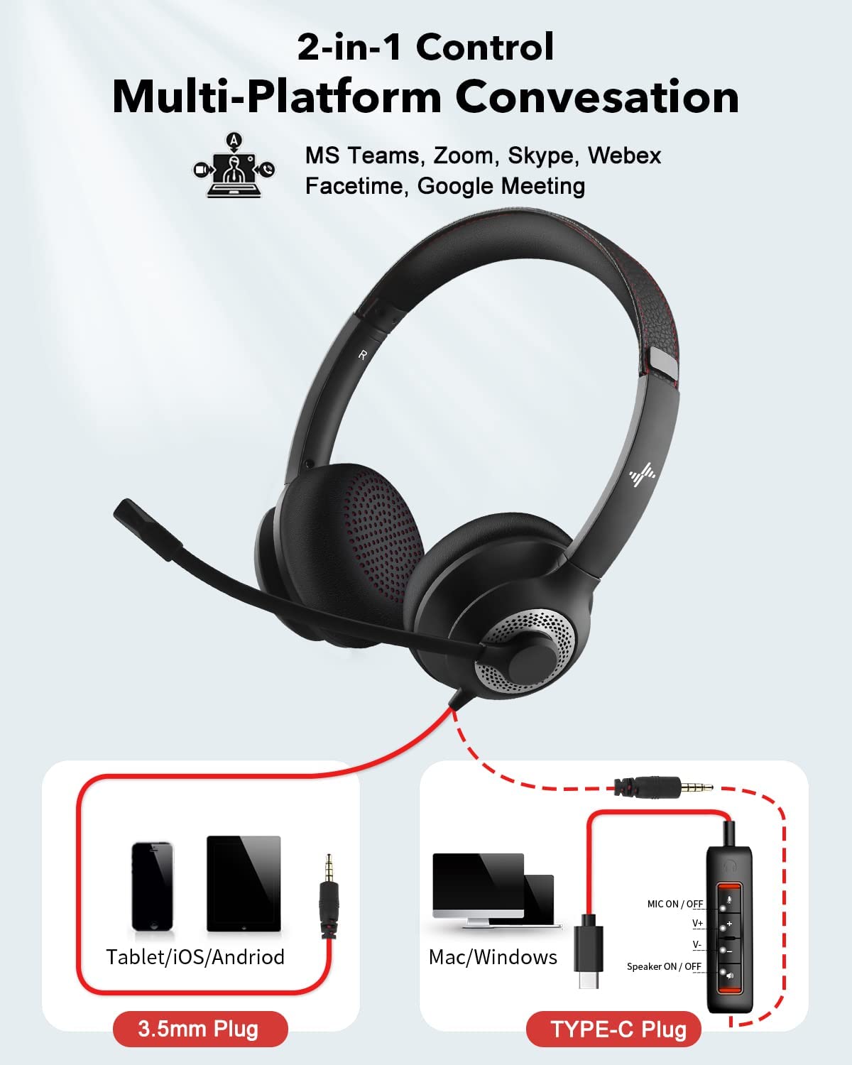 ✅【TYPE-C/3.5mm Connection】 The headphone is designed for multiple use, 3.5mm audio cable with TYPE-C In-line audio volume control (cord length 5+4 feet),with mic mute &indicators /speaker mute.Compatible with PC/Tablet/Mac/iOS/laptop /Android phone and other devices."